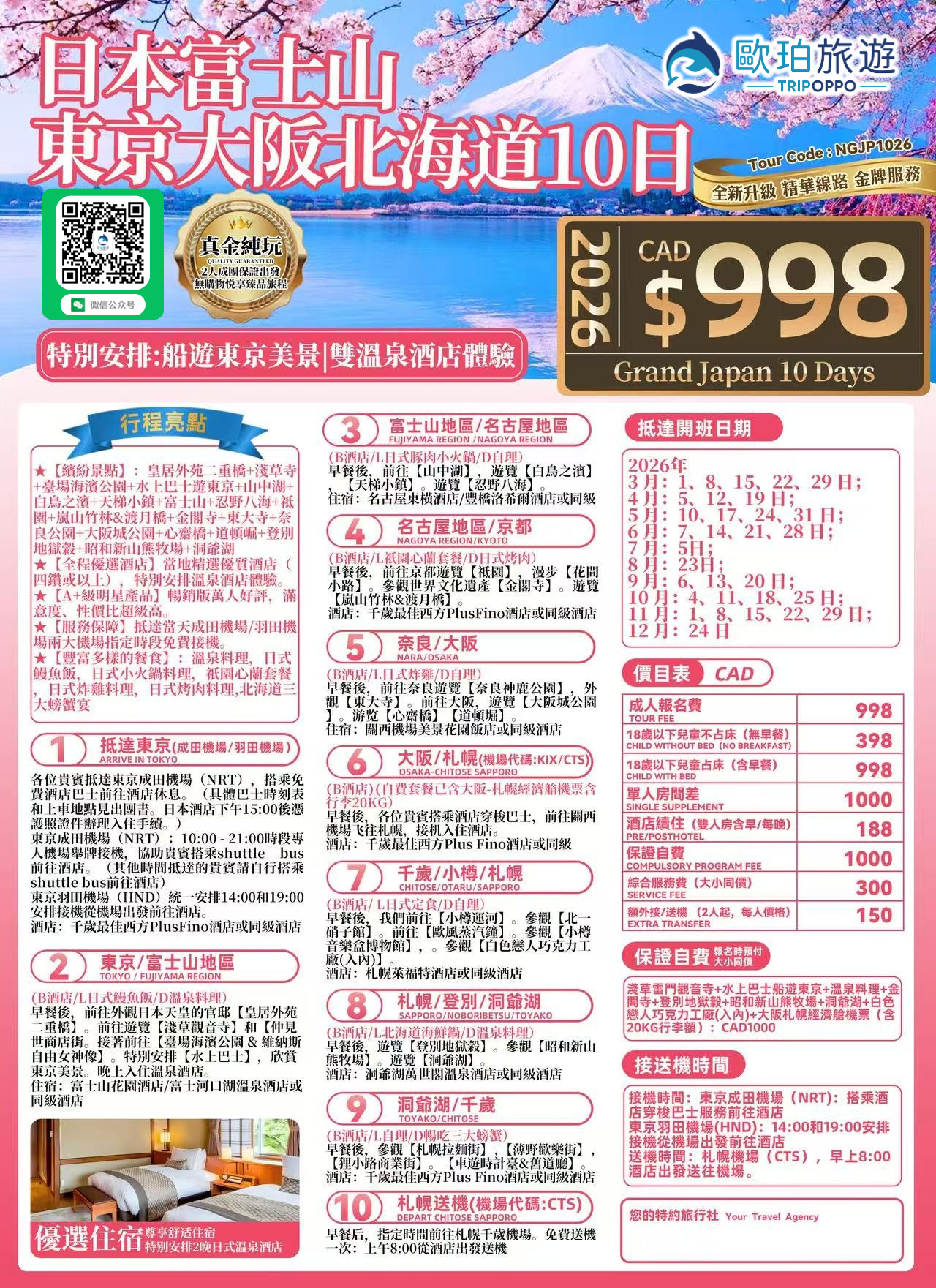 【繽紛景點】:皇居外苑二重橋+淺草寺+臺場海濱公園+水上巴士遊東京+山中湖+白鳥之賓+天梯小鎮+富士山+忍野八海+祗園+嵐山竹林&渡月橋+金閣寺+東大寺+奈良公園+大阪城公園+心齋橋+道頓崛+登別地獄穀+昭和新山熊牧場+洞爺湖