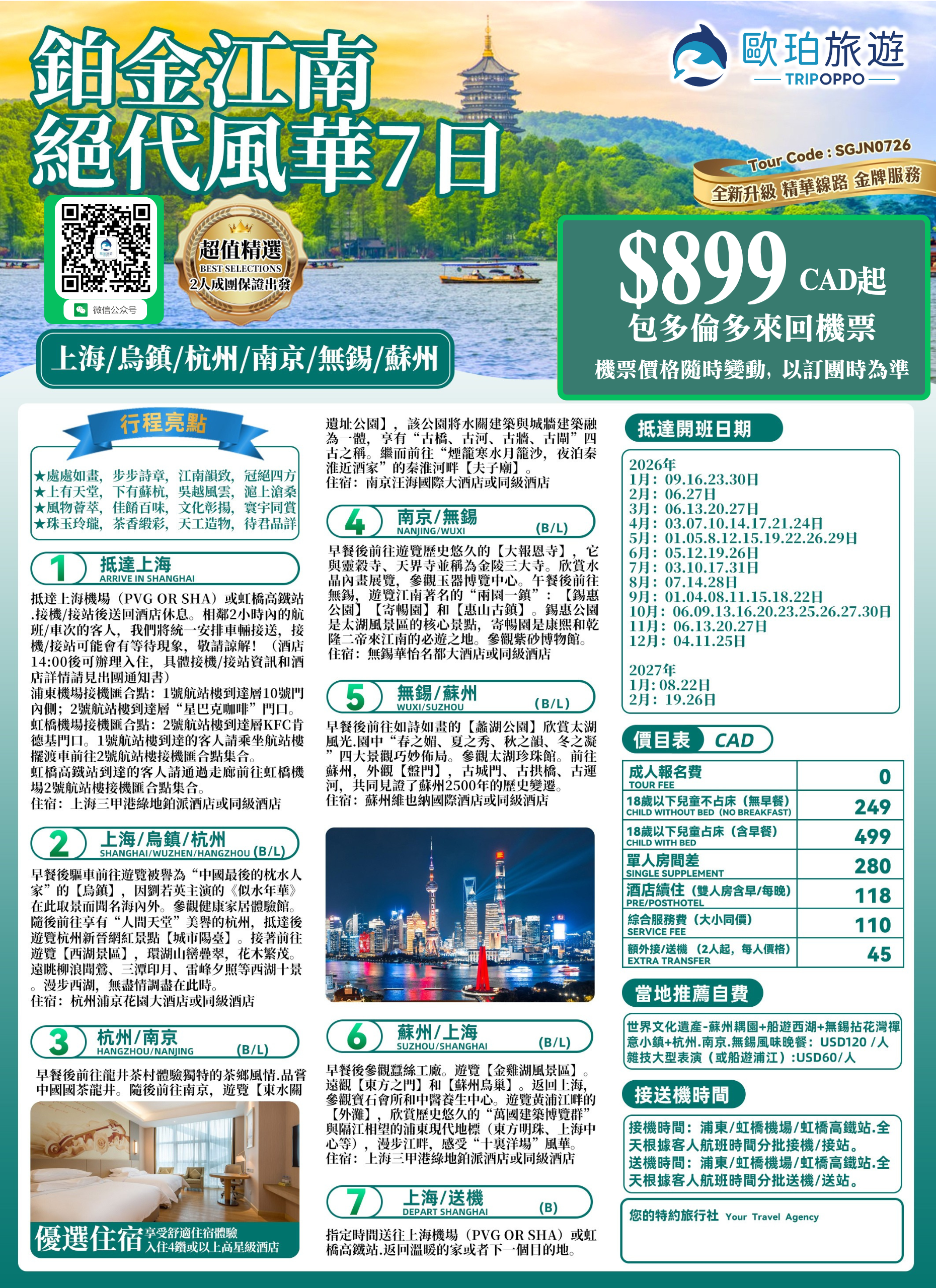 【江南全覽】上海.烏鎮.杭州.蘇州.無錫.南京。