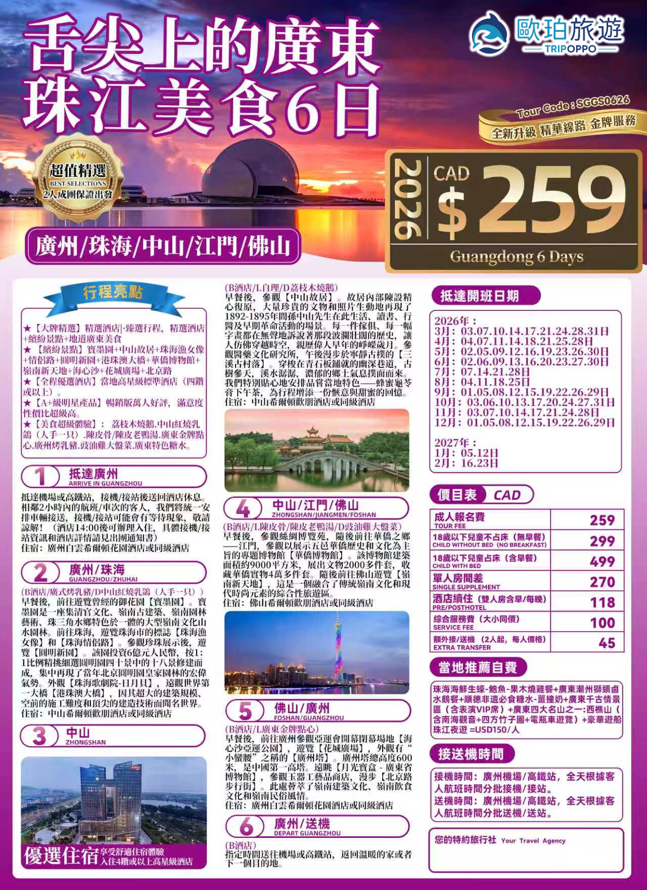 【美食超級體驗】: 荔枝木燒鵝.中山紅燒乳鴿(人手一只).陳皮骨/陳皮老鴨湯.廣東金牌點心.廣州烤乳豬.豉油雞大盤菜.廣東特色糖水。