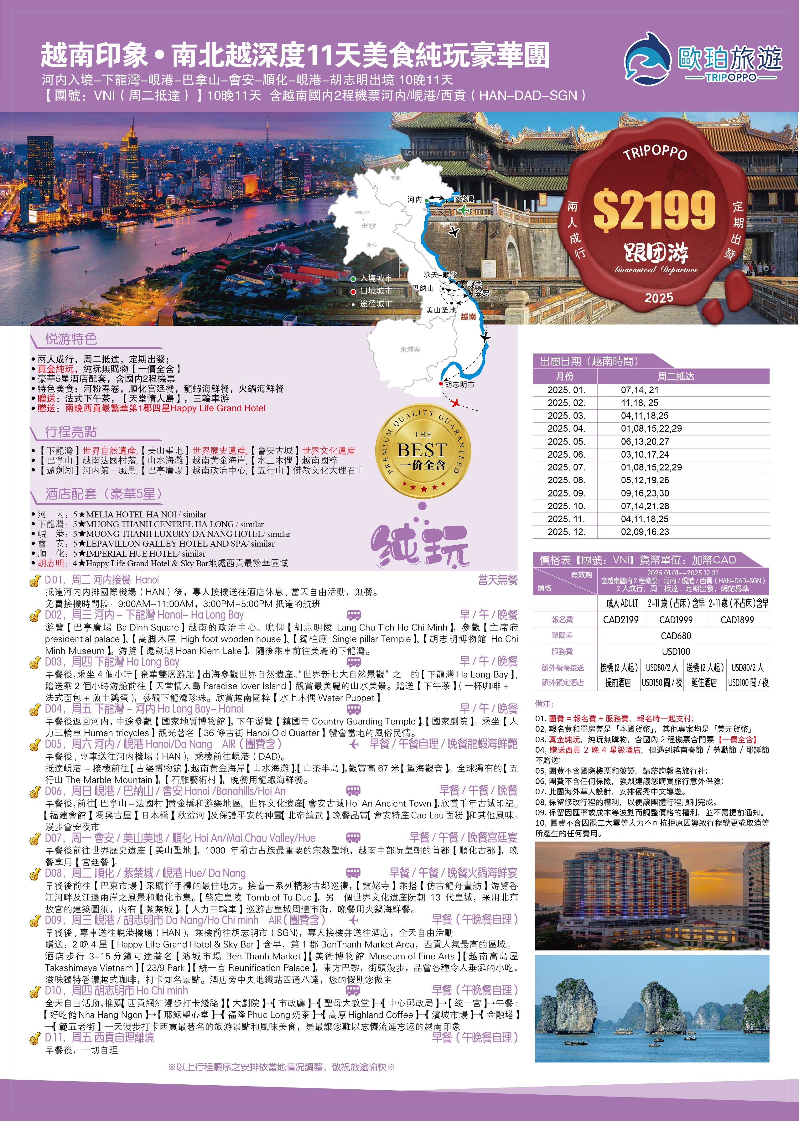 兩人成行,週二抵達,定期出發; 真金純玩,純玩無購物【一價全含】 豪華5星酒店配套,含國內2程機票 特色美食:河粉春捲,順化宮廷餐,龍蝦海鮮餐,火鍋海鮮餐 贈送:法式下午茶,【天堂情人島】,三輪車遊 贈送:兩晚西貢最繁華第1郡四星Happy Life Grand Hotel