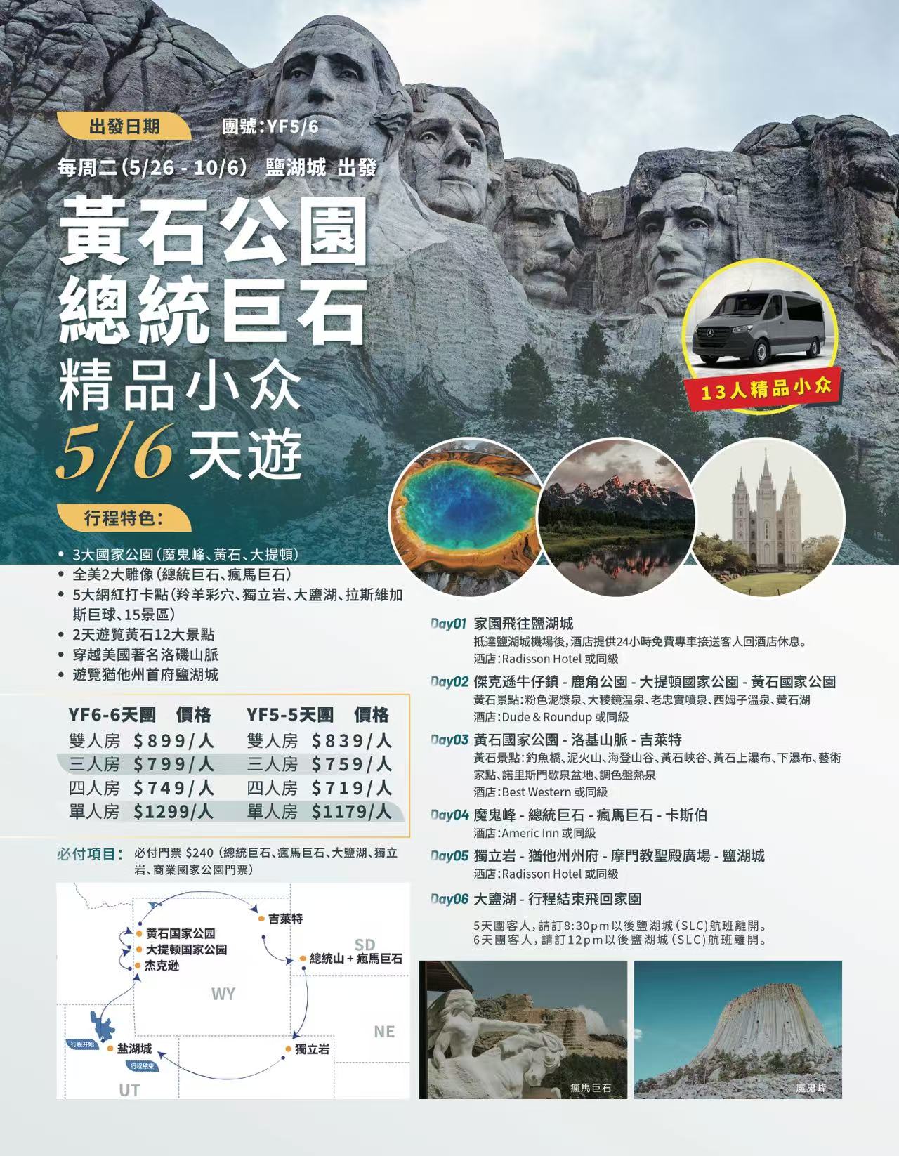 美國 黃石公園 總統巨石5/6天精華遊(13人精品小眾團)