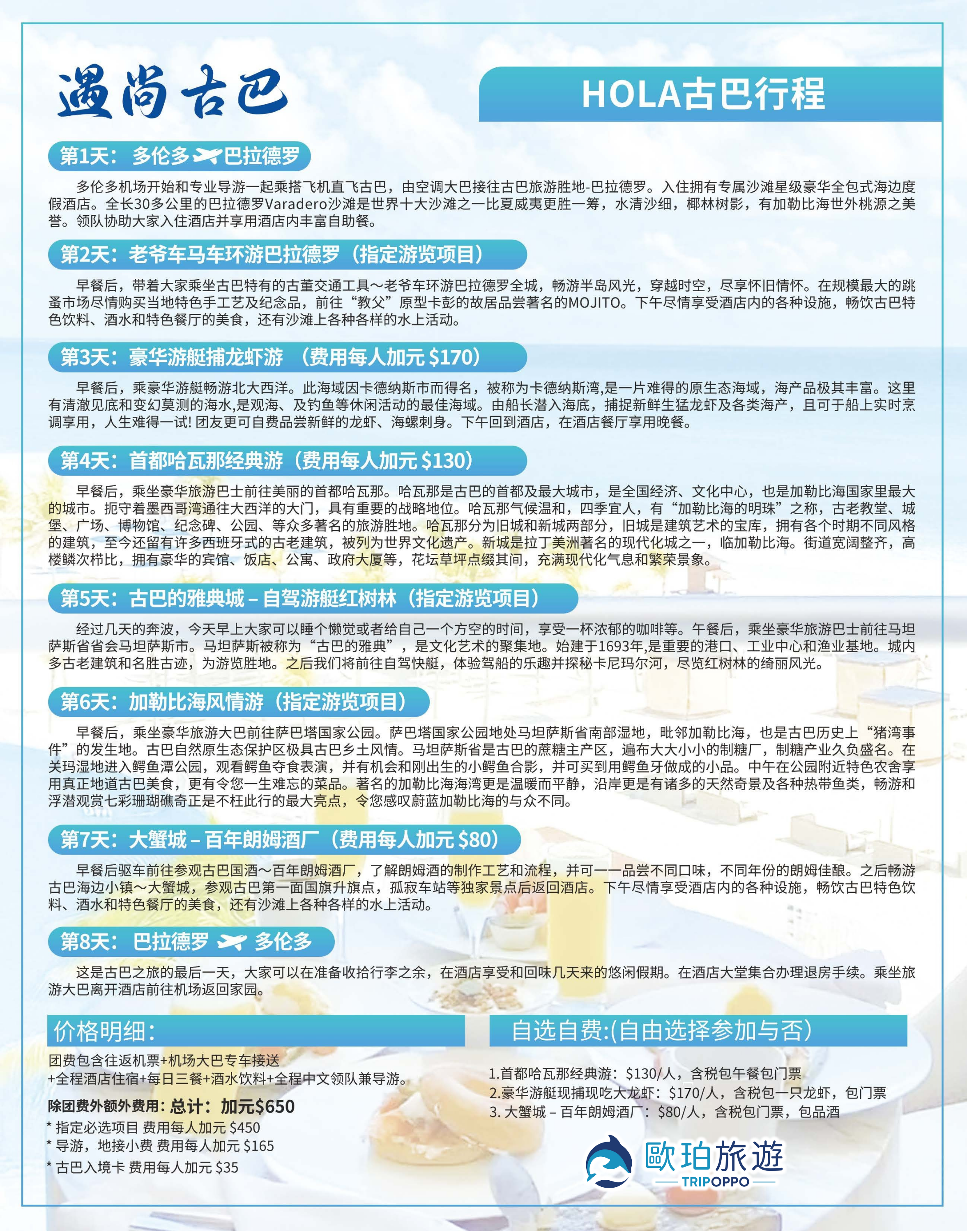 最終價格 = 團費 + 指定遊覽費用($450) + 導遊,地接小費($165) + 古巴入境卡($35) + 自選遊覽項目