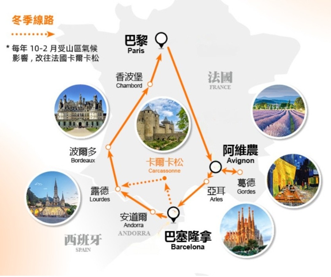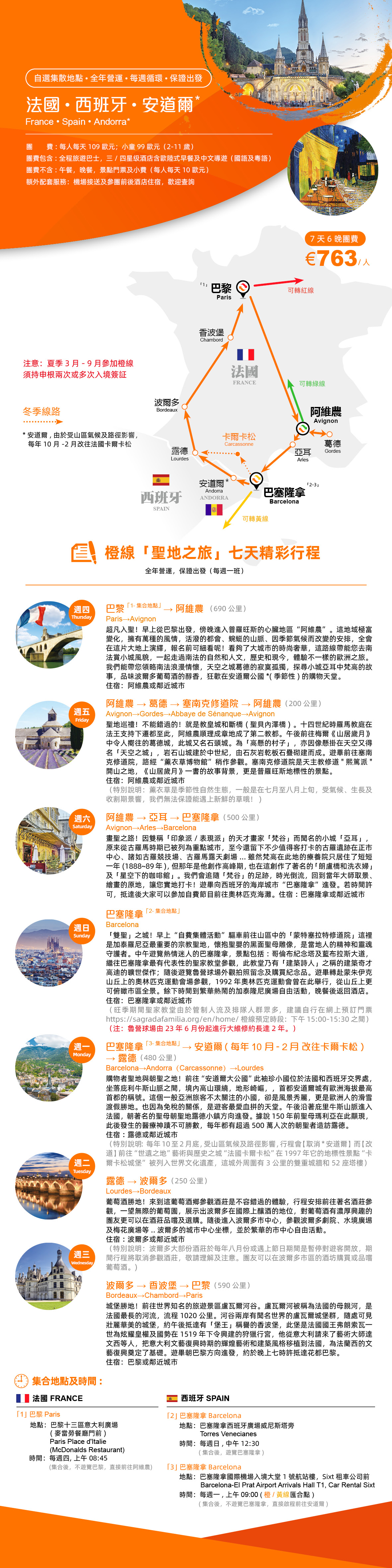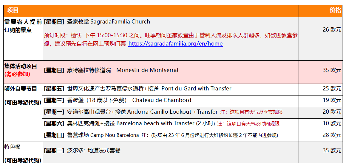 Tips:橙线可提供免费及付费接送机和参团前后酒店的城市:巴黎、巴塞罗拿。(免费接送机只在指定时间及地点提供)