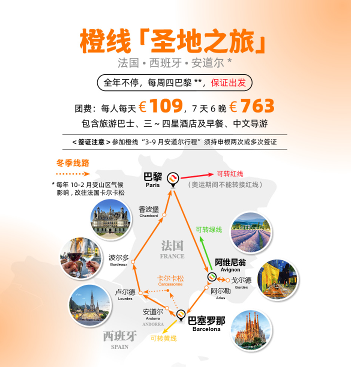 注意:夏季3 月-9 月参加橙线须持申根两次或多次签証