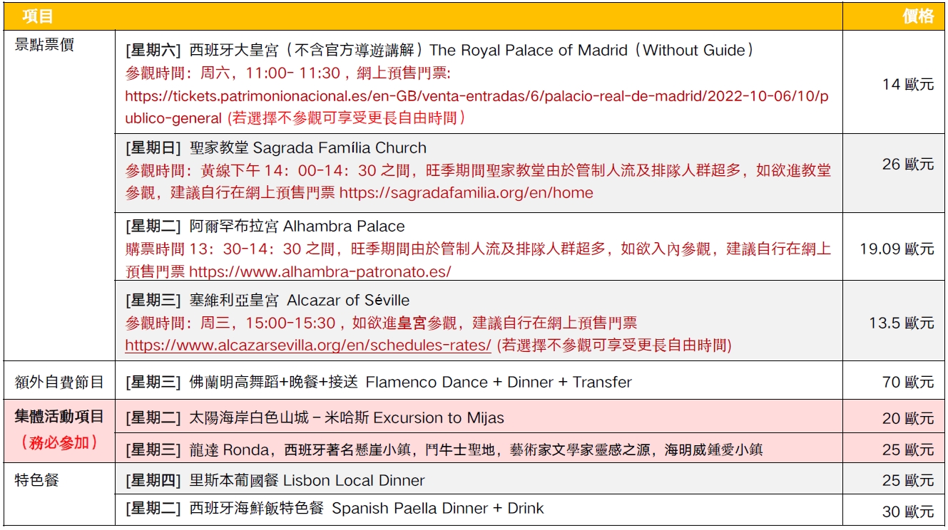 Tips:黄线可提供免费及付费接送机和参团前后酒店的城市:马德里、巴塞罗拿、里斯本*(*注意:里斯本无法提供团前酒店)(免费接送机只在指定时间及地点提供)