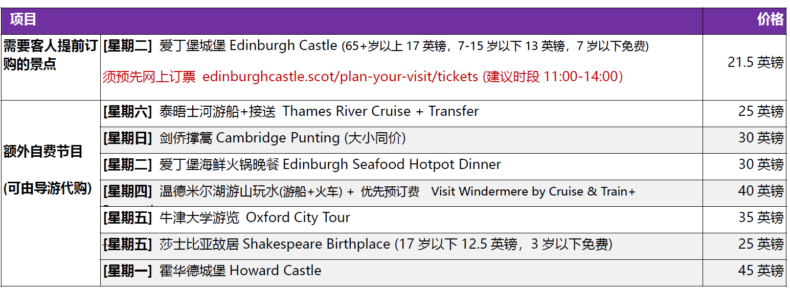 【说明】团友可按个人喜好,决定是否参加用餐、景点或自费节目,绝非强迫规定,但每人每天必须支付给导游及司机小费共10 英镑。