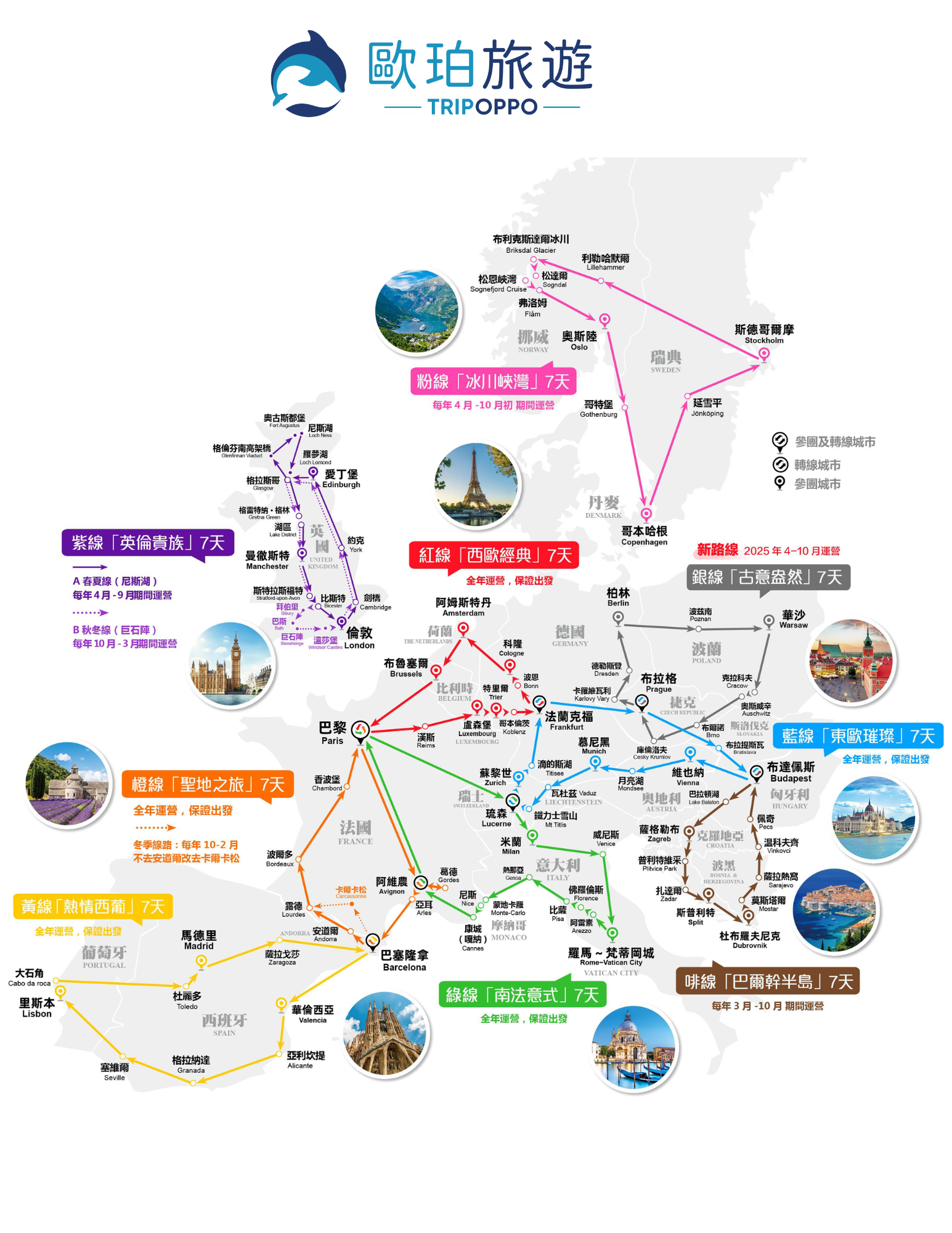 10 条欧洲旅游路线,每周循环,畅游23 个国家84 座城市!