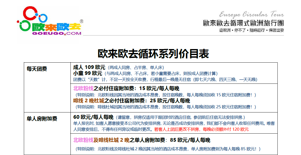 4. 若客人上团后更改不拼房,每晚必须额外付 120 欧元