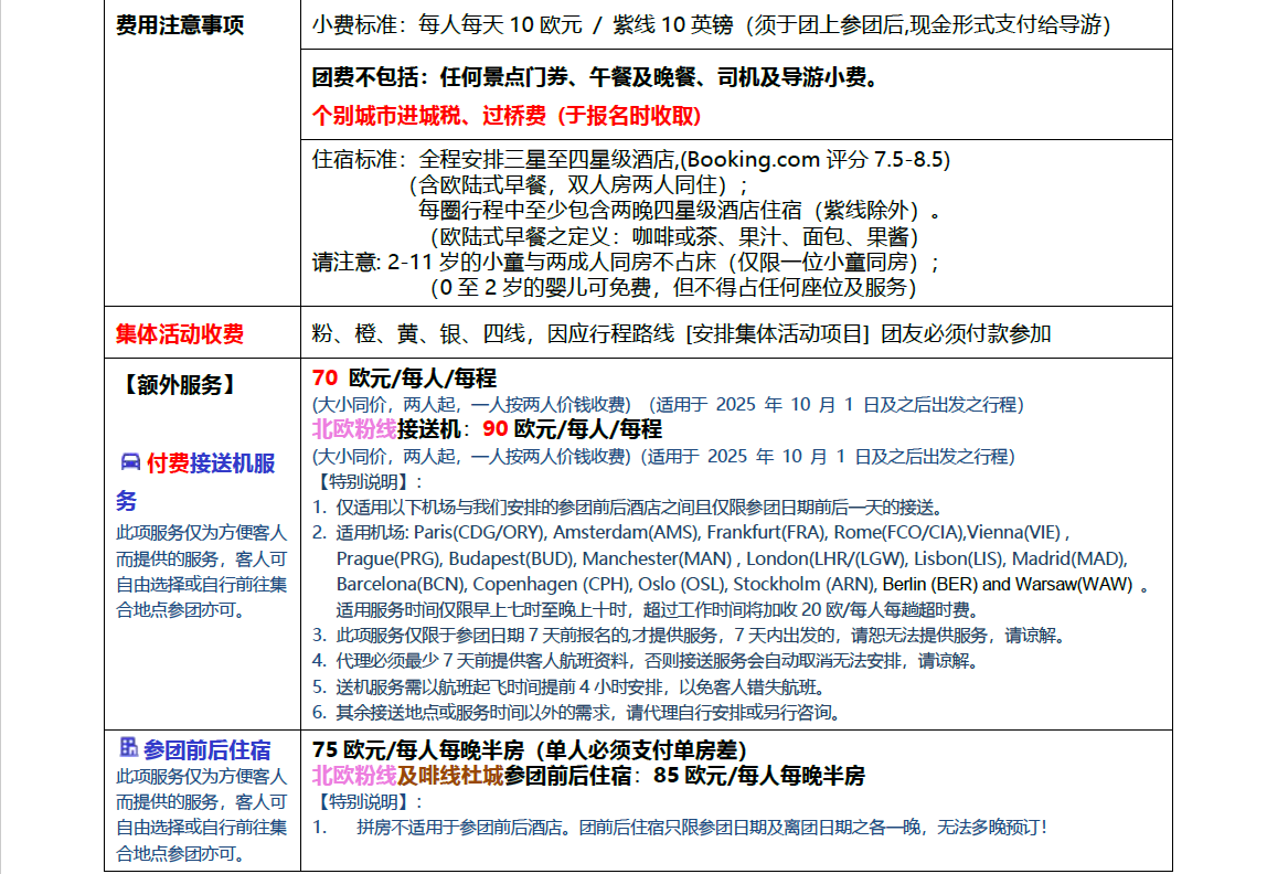 8. 小费标准:每天 10 欧元 / 紫线 10 英镑(须于团上参团后,现金形式支付给导游)