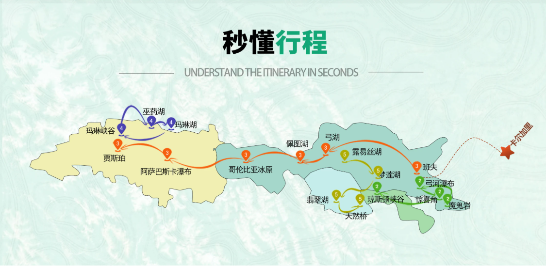 精华景点:露易丝湖、梦莲湖(季节性)、佩托湖、玛琳湖、冰原大道、阿萨巴斯卡冰川、翡翠湖、琼斯顿峡谷、天然桥