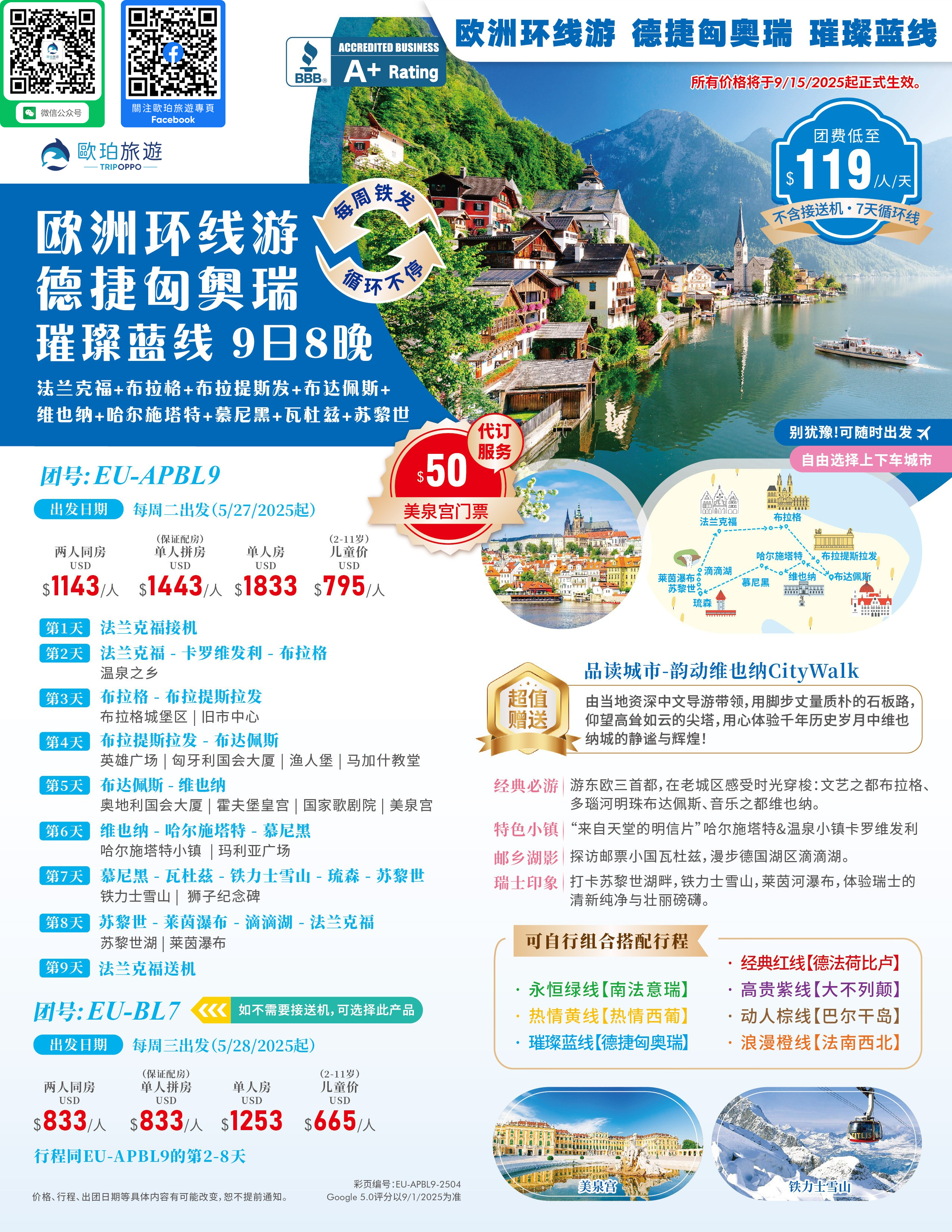 【璀璨藍線】東歐古韻 | 法蘭克福+布拉格+布拉提斯發+布達佩斯+維也納+哈爾施塔特+慕尼黑+瓦杜茲+蘇黎世 7~9天遊