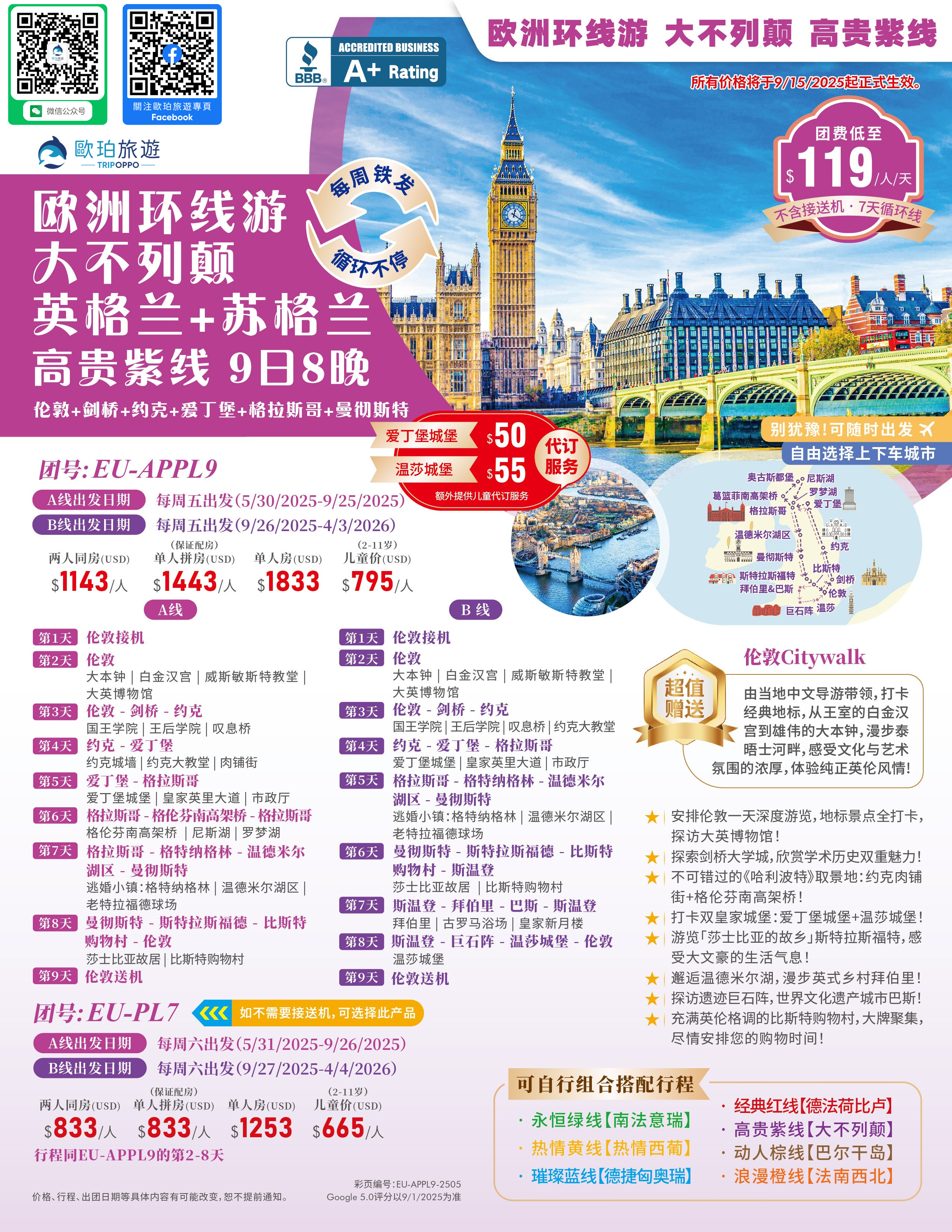 【高貴紫線】英國之旅 | 倫敦接送機+劍橋+約克+愛丁堡+格拉斯哥+曼徹斯特 7~9天遊