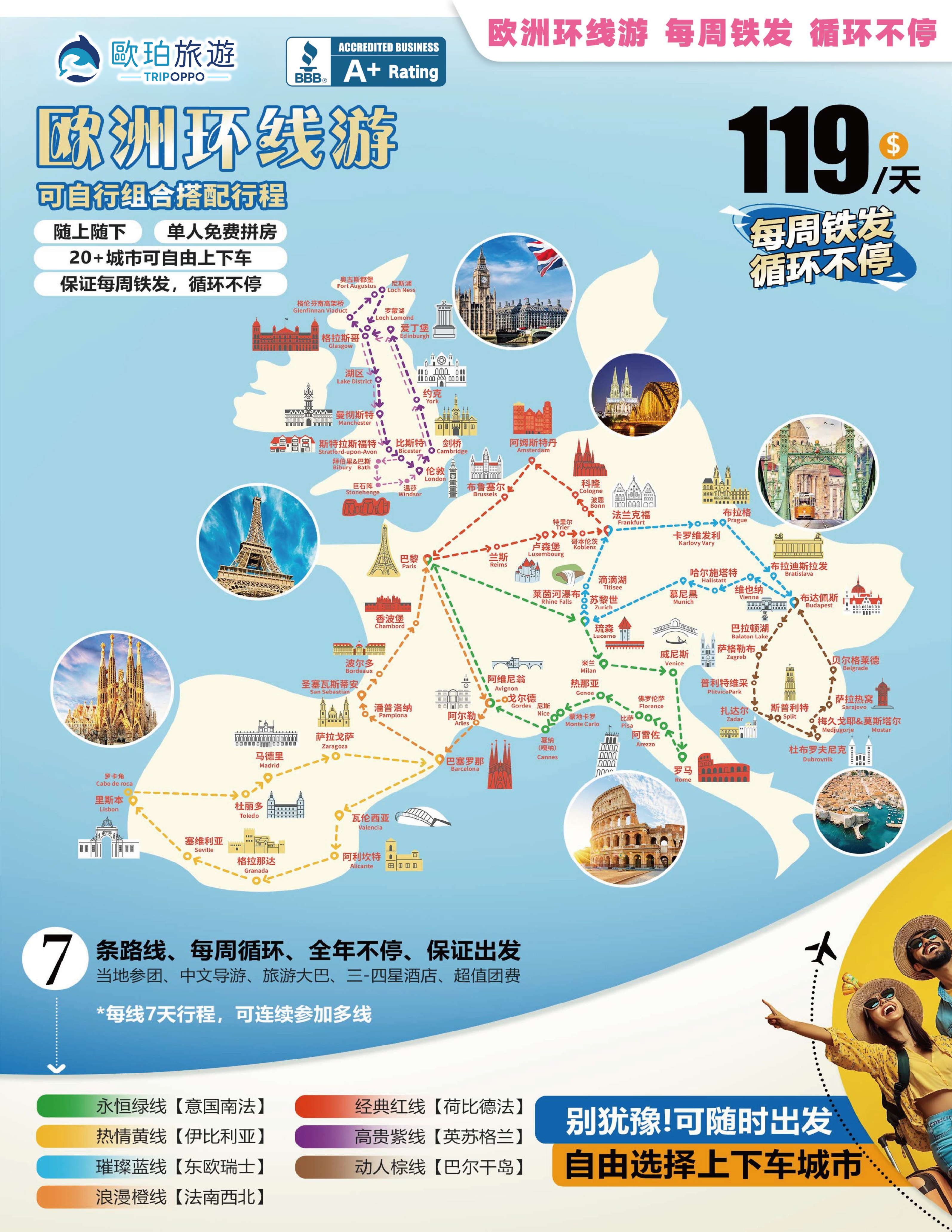 红、绿、蓝、黄、棕、橙,紫均可选择,每周出发,固定行程,固定的顺序全年循环不停