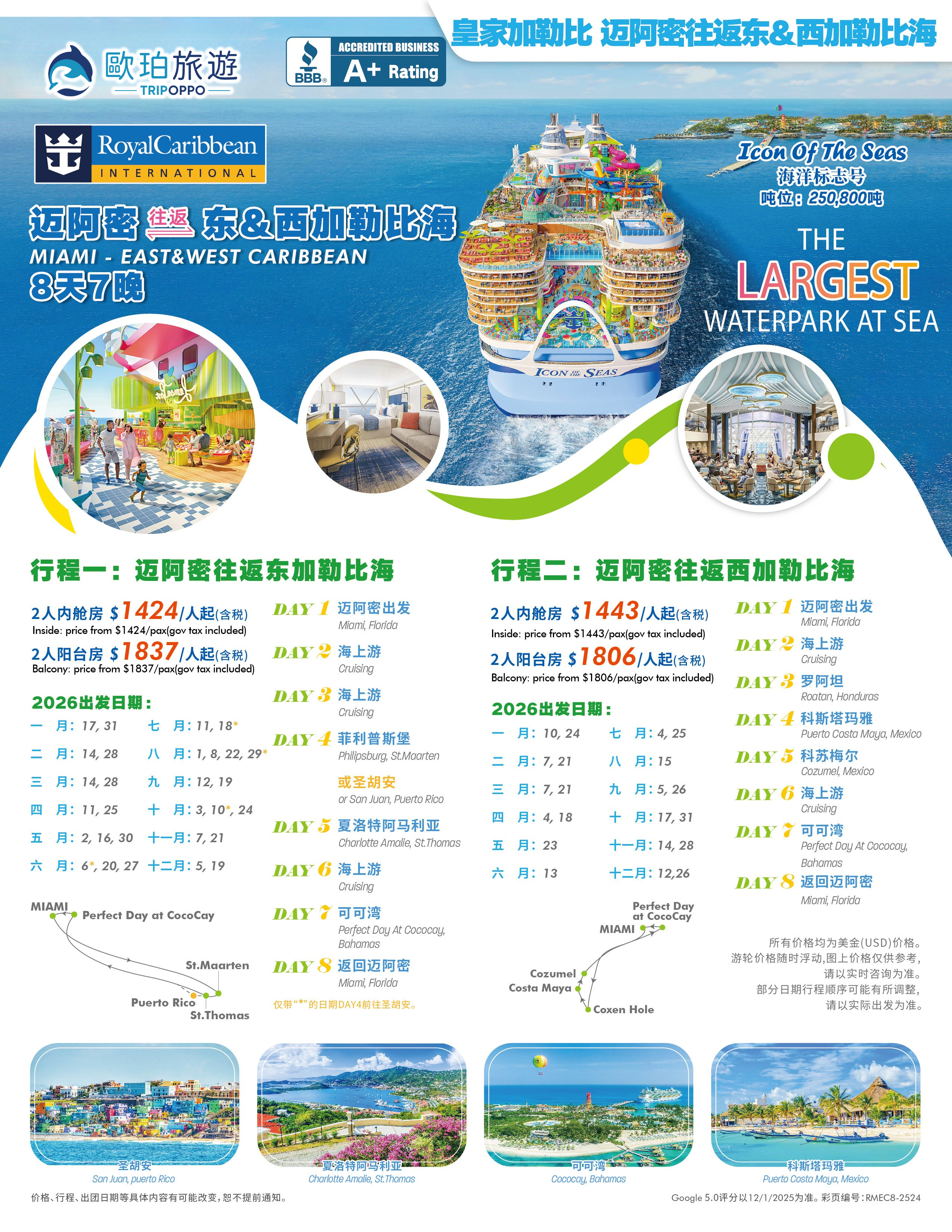 尽情探索皇家加勒比的梦幻航程,体验无与伦比的加勒比海风光! 全世界最大新船--250,800吨的Icon Of The Seas(海洋标志号)执航! 执航行程:【迈阿密往返加勒比海】8天7晚精华游~ 从迈阿密出发,畅游东/西加勒比海,尽情享受“海上最大水上乐园”。