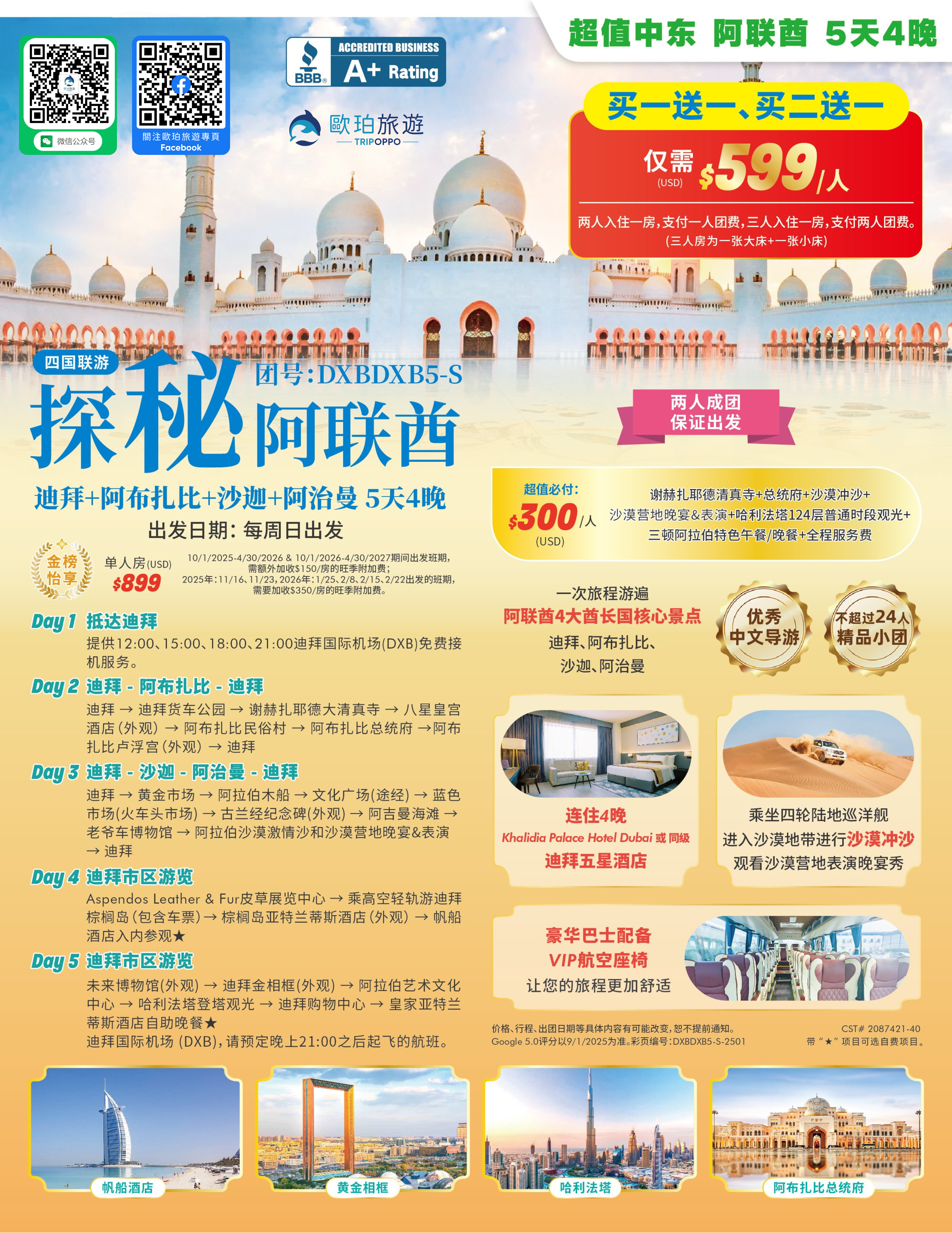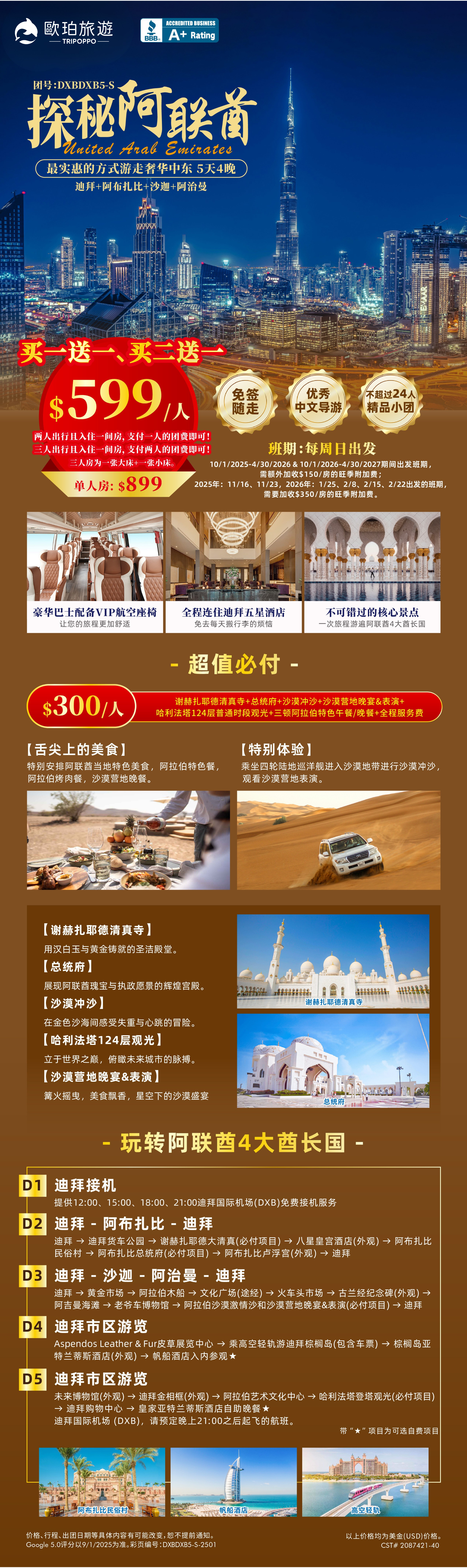 迪拜,这座融合现代奢华与独特文化的国际都市,以世界级的购物天堂、壮观的摩天大楼和便捷的签证政策,成为全球旅行者心中的梦幻目的地。年末将至,迪拜的异域风情与奢华购物,正是犒劳自己、放松身心的理想选择。现特别推出迪拜精品小团,一次旅程畅游阿联酋四大酋长国:迪拜、阿布扎比、沙迦、阿治曼核心景点。行程安排四轮陆地巡洋舰驰骋沙漠、体验冲沙快感,欣赏沙漠营地表演,品味阿联酋当地美食。全程两人成团,保证出发不超过24人,优秀中文导游、豪华巴士配备VIP航空座椅;贴心安排连住四晚迪拜五星酒店,轻松舒适,无需每日搬运行李。