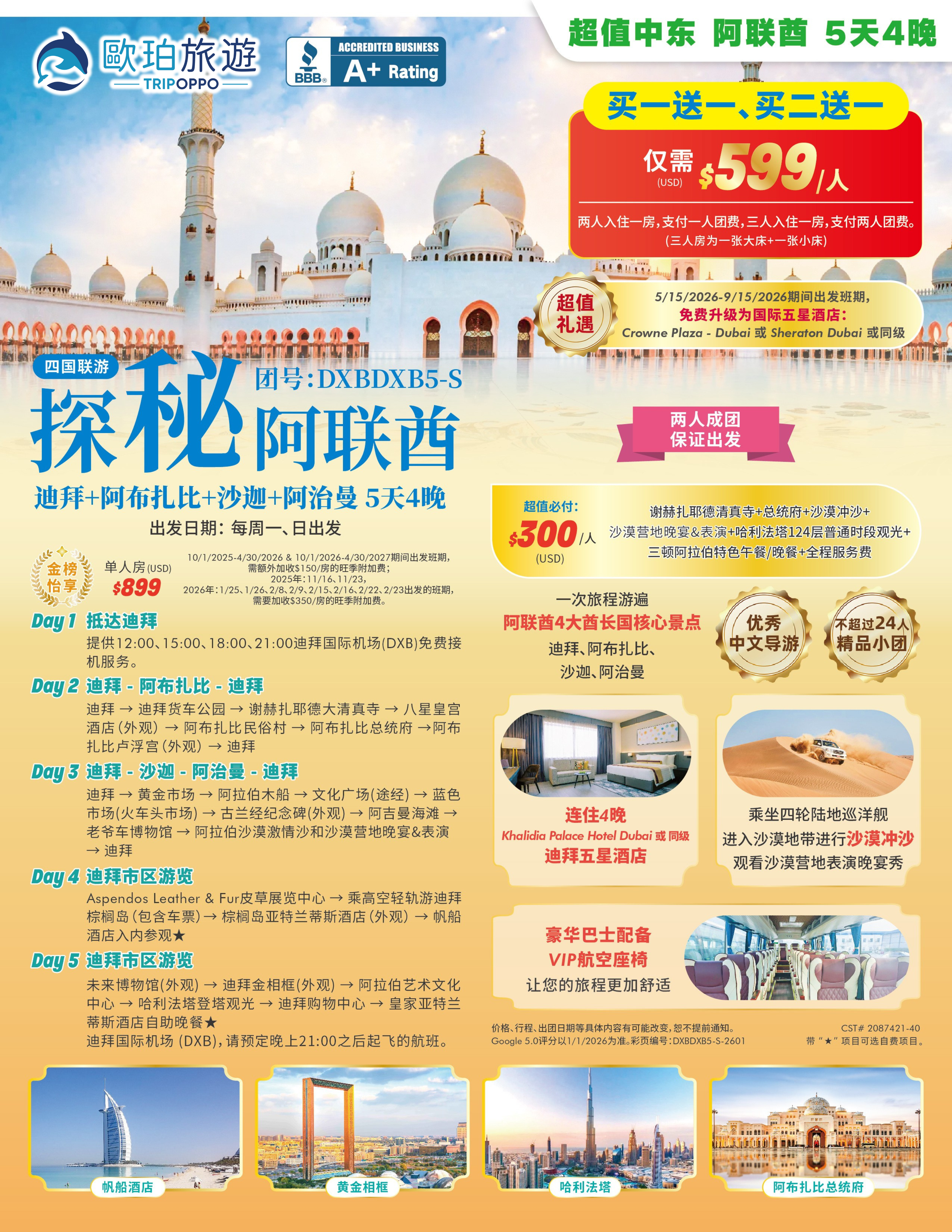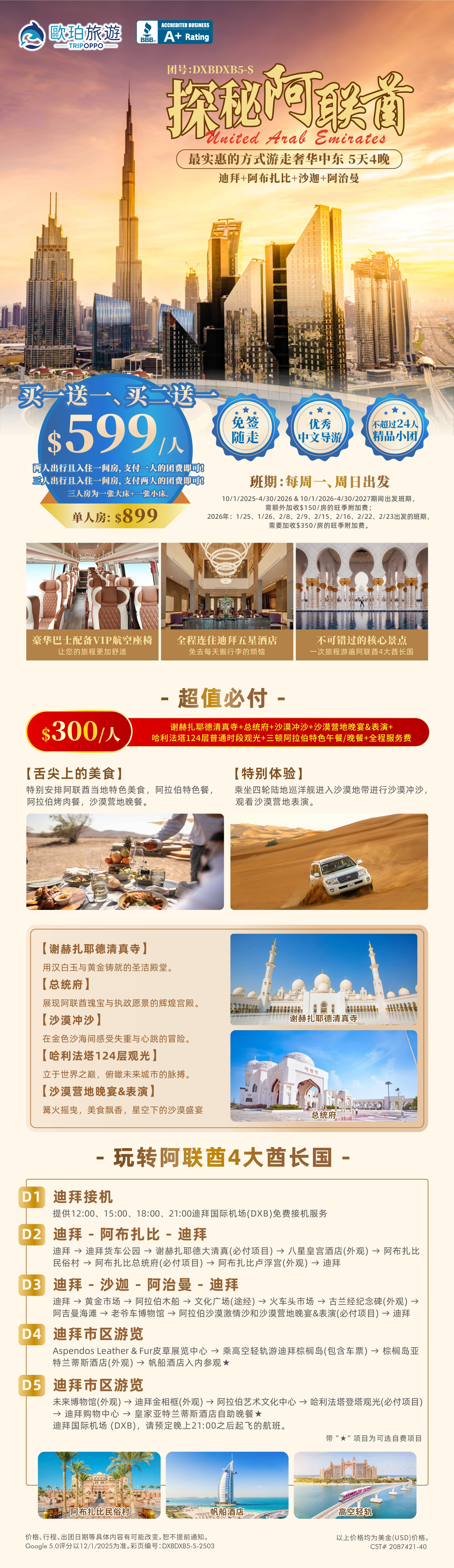 迪拜,这座融合现代奢华与独特文化的国际都市,以世界级的购物天堂、壮观的摩天大楼和便捷的签证政策,成为全球旅行者心中的梦幻目的地。年末将至,迪拜的异域风情与奢华购物,正是犒劳自己、放松身心的理想选择。现特别推出迪拜精品小团,一次旅程畅游阿联酋四大酋长国:迪拜、阿布扎比、沙迦、阿治曼核心景点。行程安排四轮陆地巡洋舰驰骋沙漠、体验冲沙快感,欣赏沙漠营地表演,品味阿联酋当地美食。全程两人成团,保证出发;不超过24人,优秀中文导游、豪华巴士配备VIP航空座椅;贴心安排连住四晚迪拜五星酒店,轻松舒适,无需每日搬运行李。