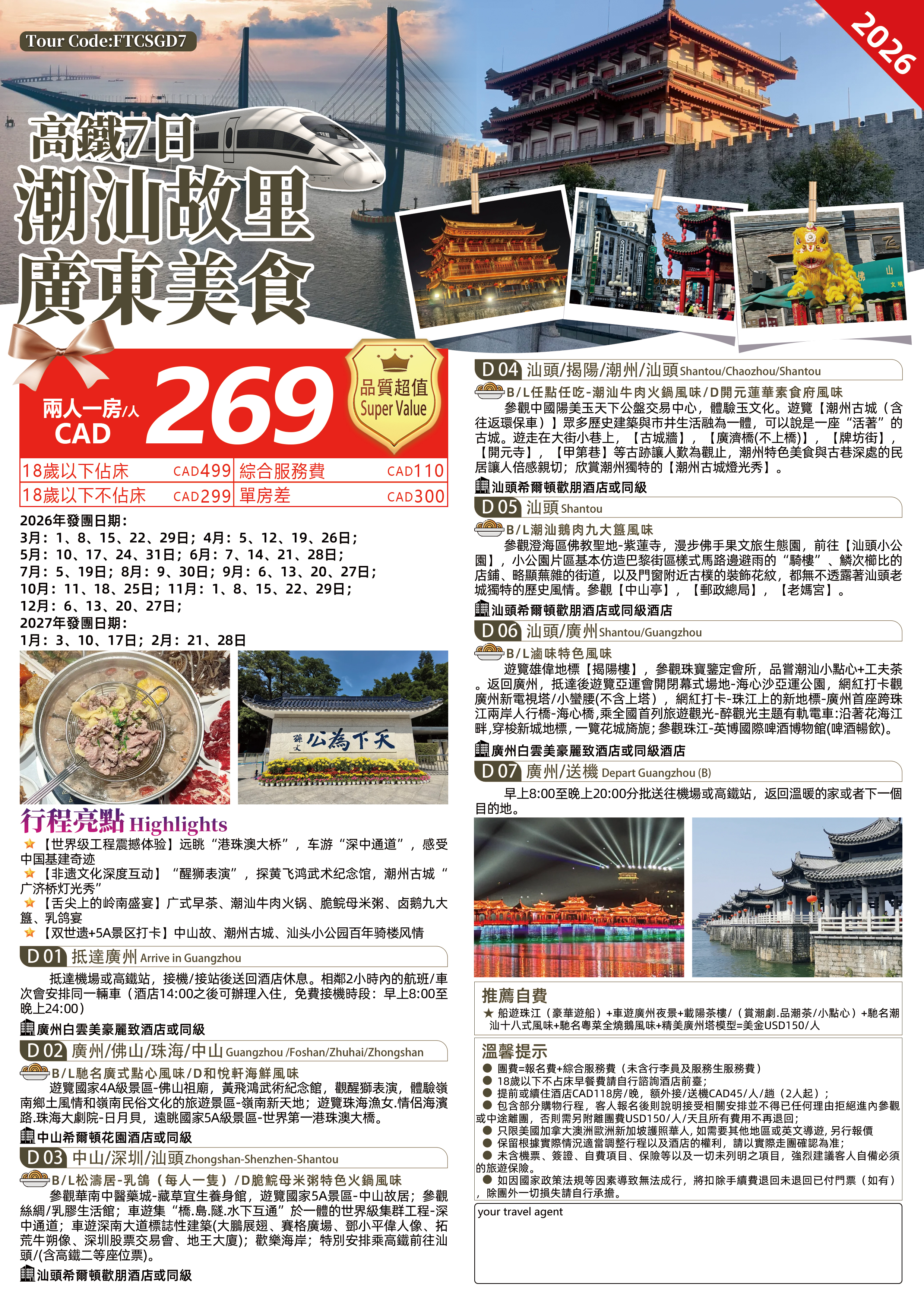 行程特色 【世界级工程震撼体验】远眺“港珠澳大桥”,车游“深中通道”,感受中国基建奇迹 【非遗文化深度互动】“醒狮表演”,探黄飞鸿武术纪念馆,潮州古城“广济桥灯光秀” 【舌尖上的岭南盛宴】广式早茶、潮汕牛肉火锅、脆鲩母米粥、卤鹅九大簋、乳鸽宴 【双世遗+5A景区打卡】中山故、潮州古城、汕头小公园百年骑楼风情
