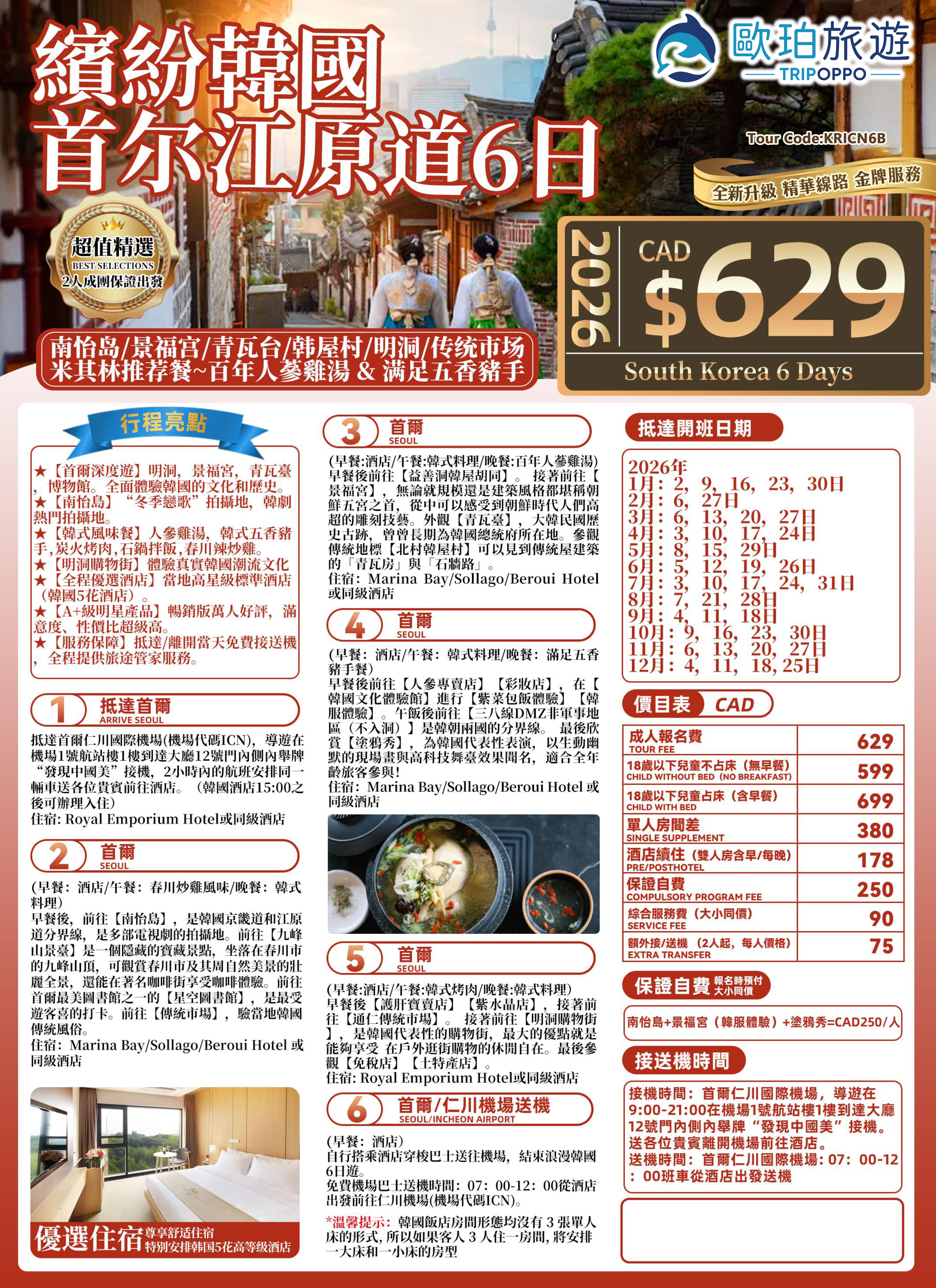 【全程優選酒店】當地高星級標準酒店(韩国5花酒店)。