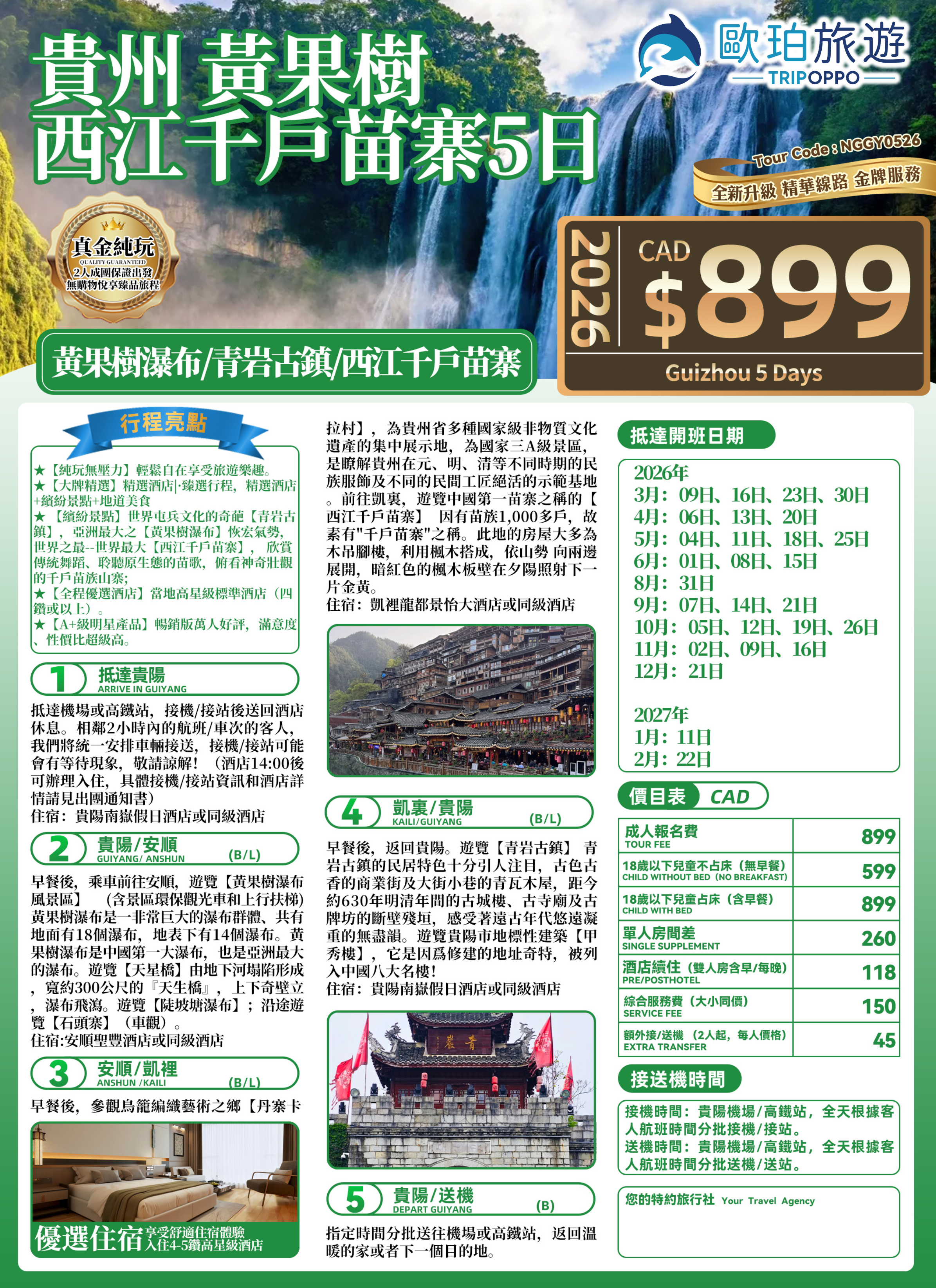 【繽紛景點】世界屯兵文化的奇葩【青岩古鎮】,亞洲最大之【黃果樹瀑布】恢宏氣勢,世界之最--世界最大【西江千戶苗寨】, 欣賞傳統舞蹈、聆聽原生態的苗歌,俯看神奇壯觀的千戶苗族山寨;