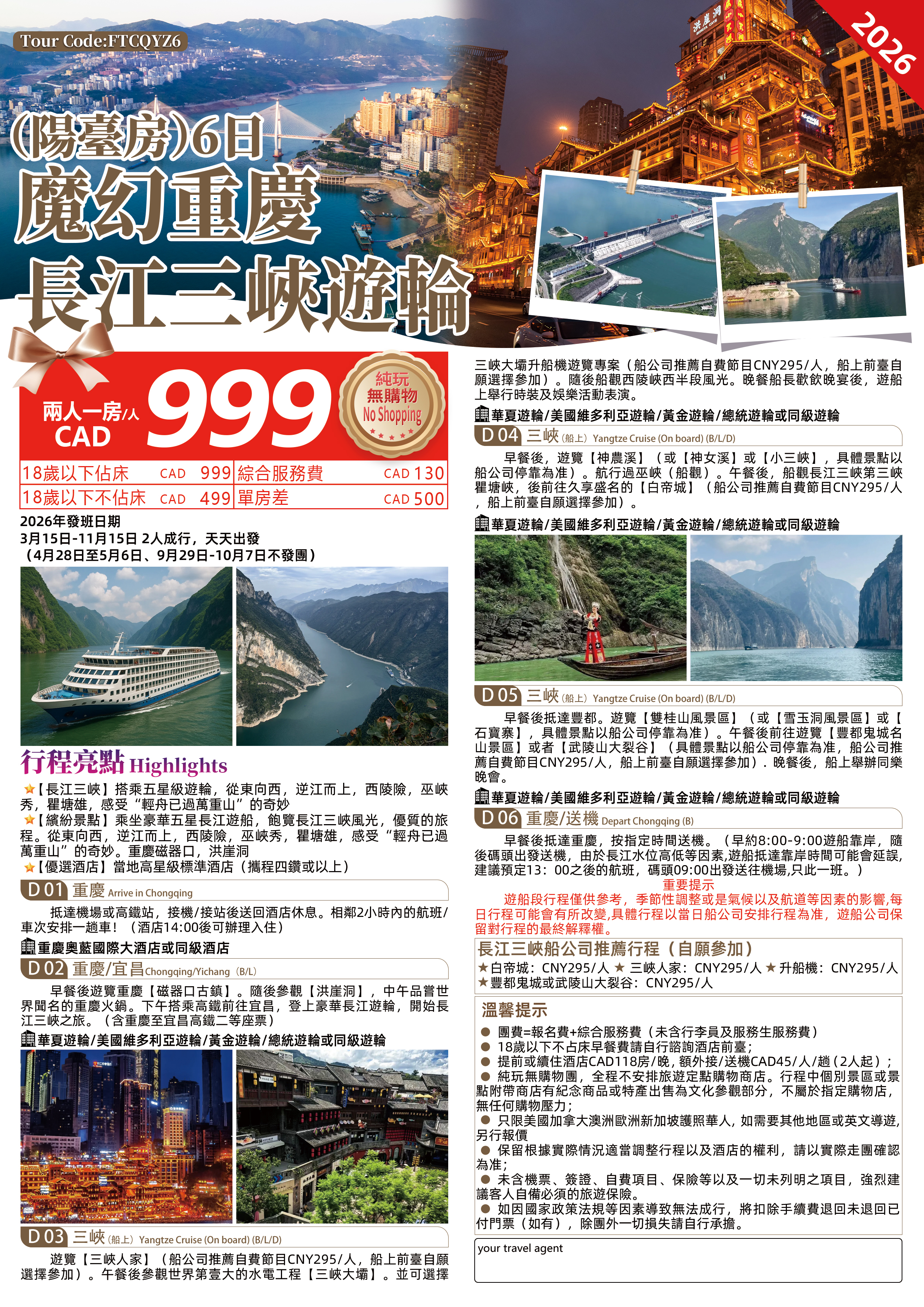 【繽紛景點】乘坐豪華五星長江遊船,飽覽長江三峽風光,優質的旅程。從東向西,逆江而上,西陵險,巫峽秀,瞿塘雄,感受“輕舟已過萬重山”的奇妙。重庆磁器口,洪崖洞