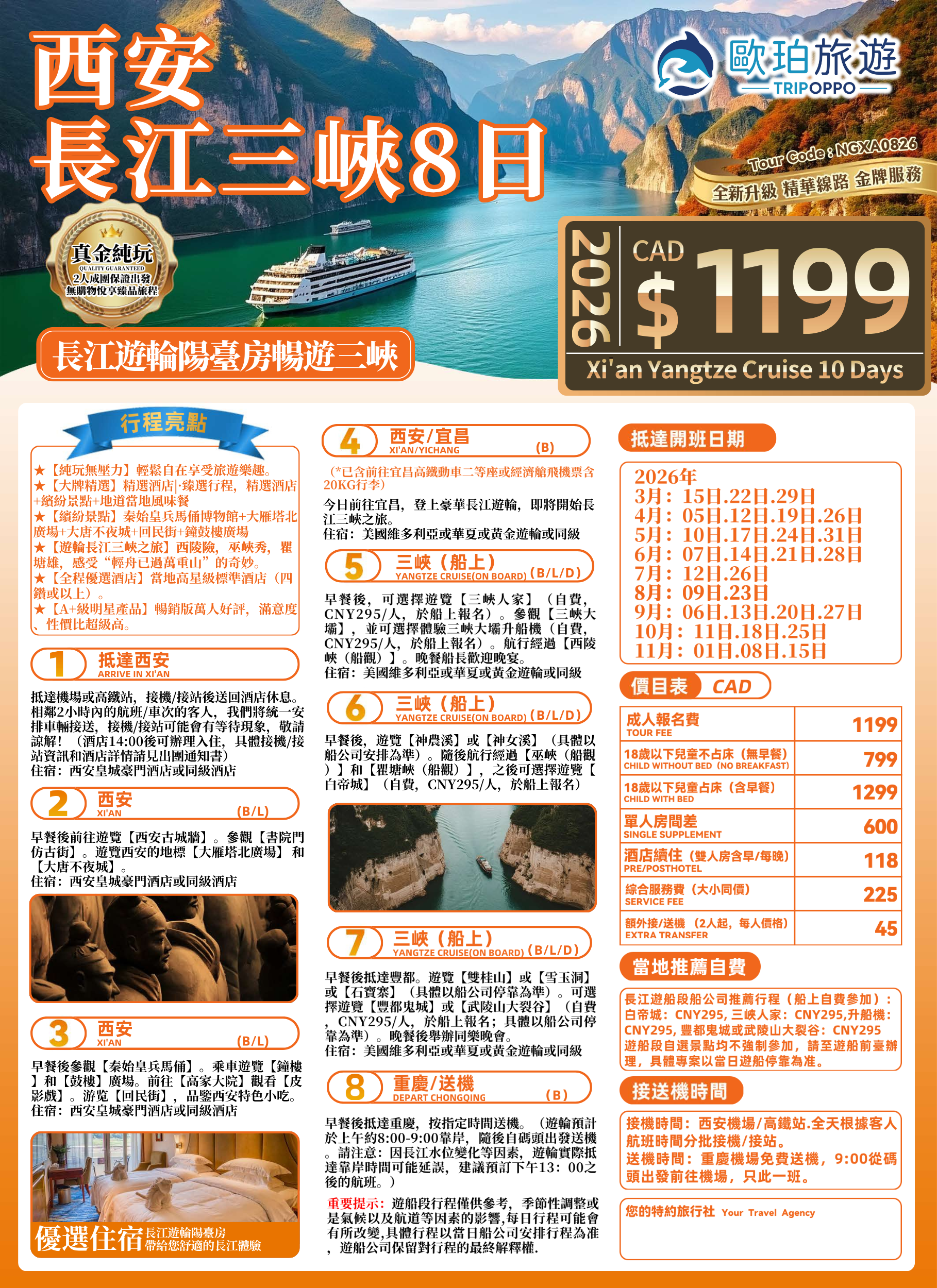 行程特色 ★【純玩無壓力】輕鬆自在享受旅遊樂趣。 ★【大牌精選】精選酒店|·臻選行程,精選酒店+繽紛景點+地道當地風味餐 ★【繽紛景點】秦始皇兵馬俑博物館+大雁塔北廣場+大唐不夜城+回民街+鐘鼓樓廣場 ★【遊輪長江三峽之旅】西陵險,巫峽秀,瞿塘雄,感受“輕舟已過萬重山”的奇妙。 ★【全程優選酒店】當地高星級標準酒店(四鑽或以上)。 ★【A+級明星產品】暢銷版萬人好評,滿意度、性價比超級高。