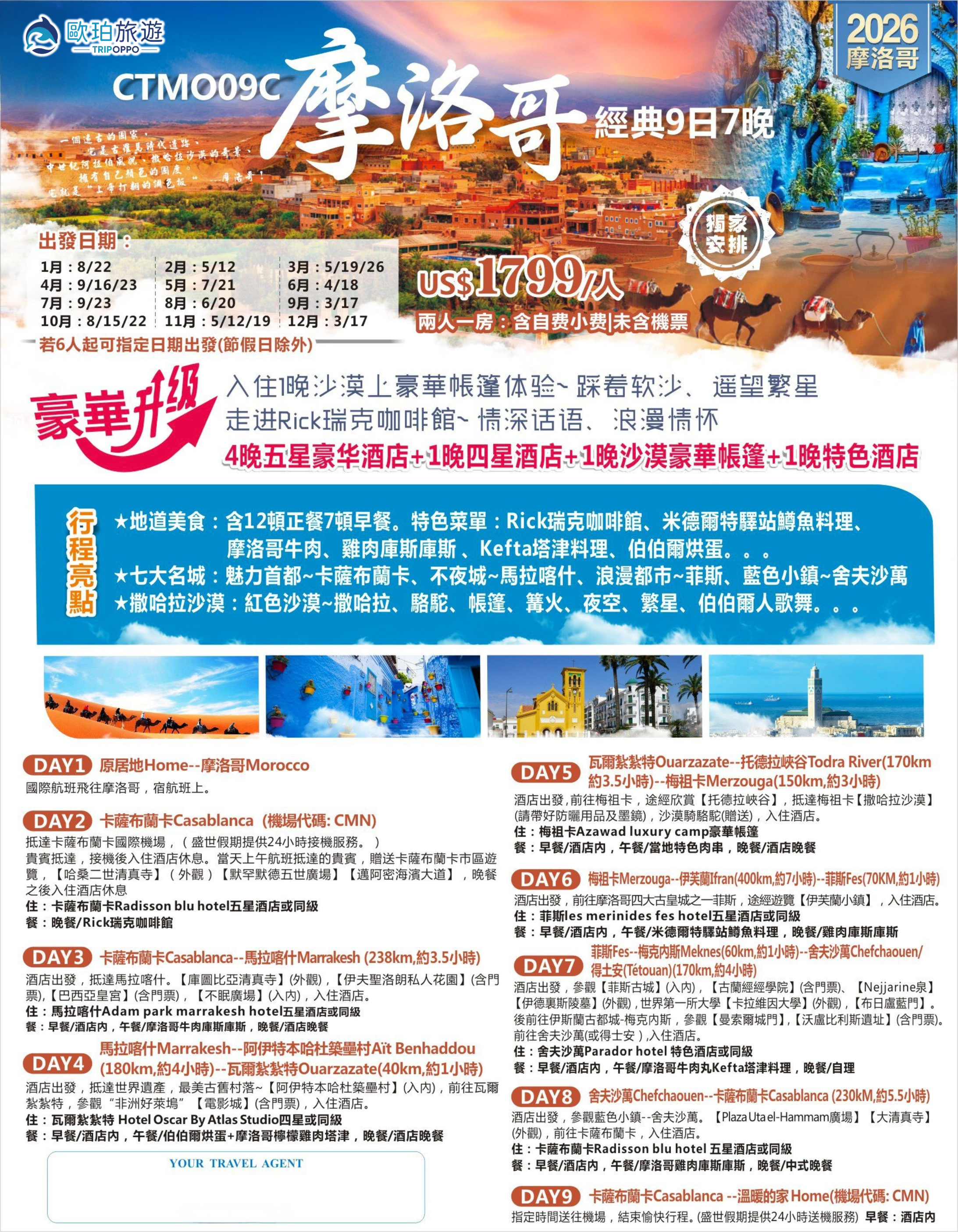 ★地道美食:含12頓正餐7頓早餐。特色菜單:Rick瑞克咖啡館、米德爾特驛站鱒魚料理、摩洛哥牛肉、雞肉庫斯庫斯 、Kefta塔津料理、伯伯爾烘蛋。。。
