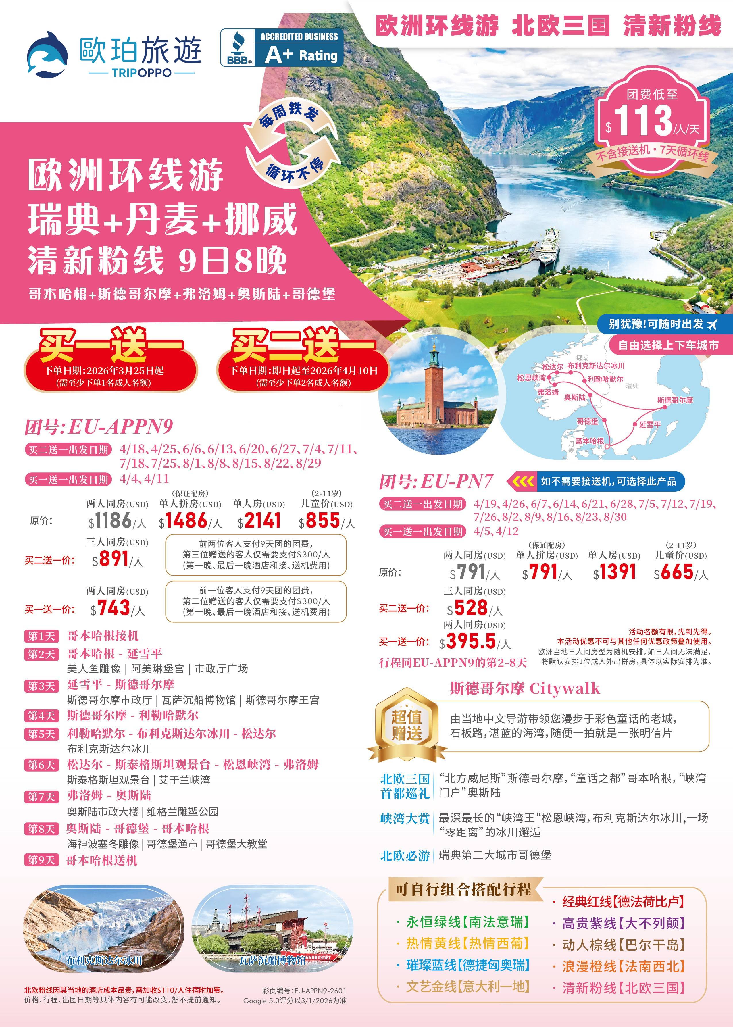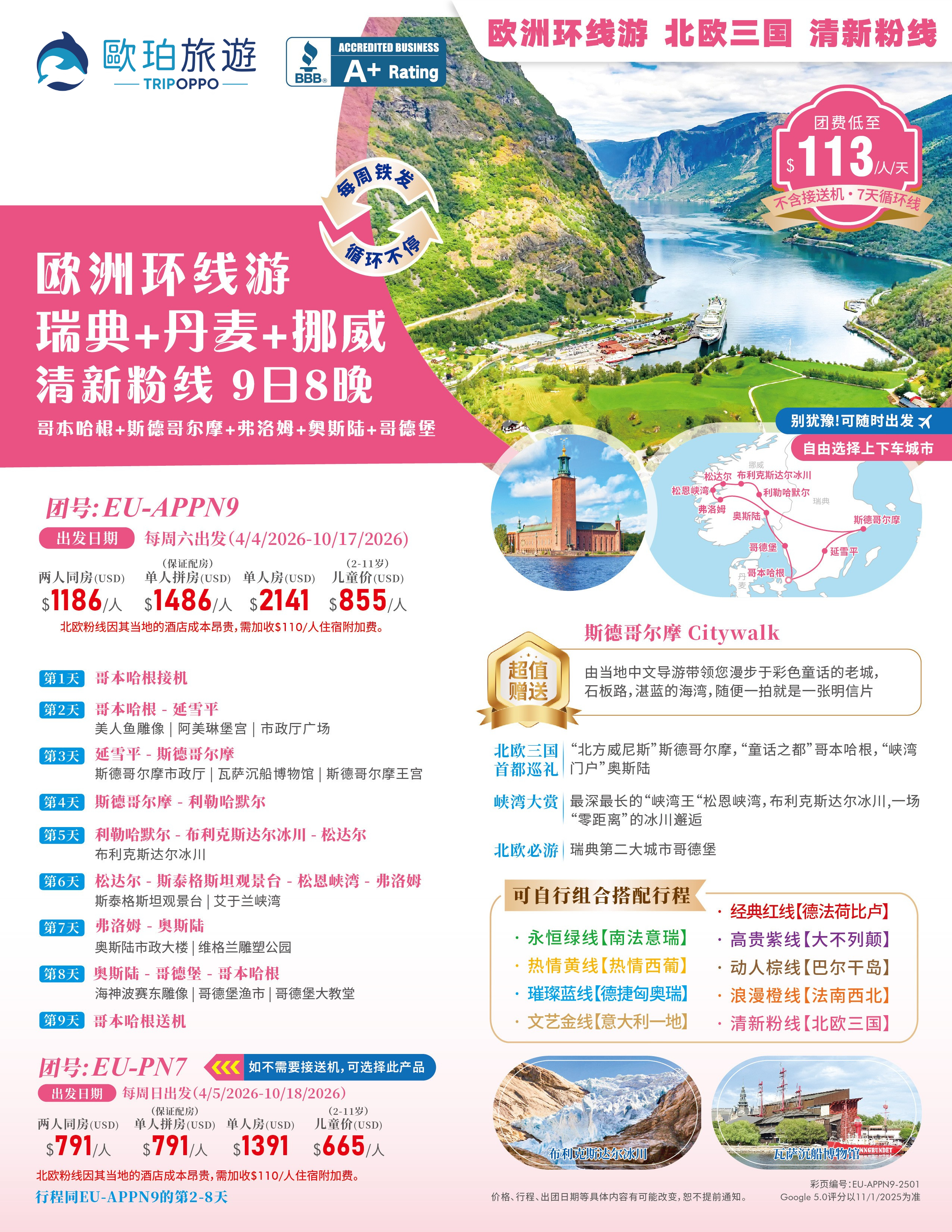 *北歐粉線因其當地的酒店成本昂貴,需加收$110/人住宿附加費。